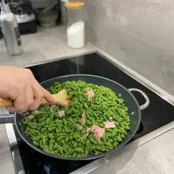 Dodaj kostki szynki i smaż je razem przez około 3 minuty, aż będą lekko chrupiące.