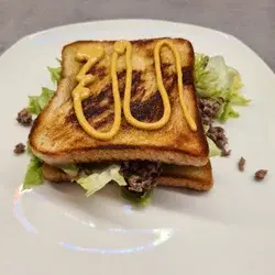 Podawaj swoją pyszną Złotą Kanapkę z Mięsem Mielonym i Sałatą natychmiast i smacznego!