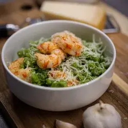 Podczas gdy spätzle się gotują i nadmiar wilgoci odparowuje, obficie zetrzyj ser Parmezan bezpośrednio na danie na patelni. Mieszaj, aby się roztopił i pokrył spätzle i krewetki.